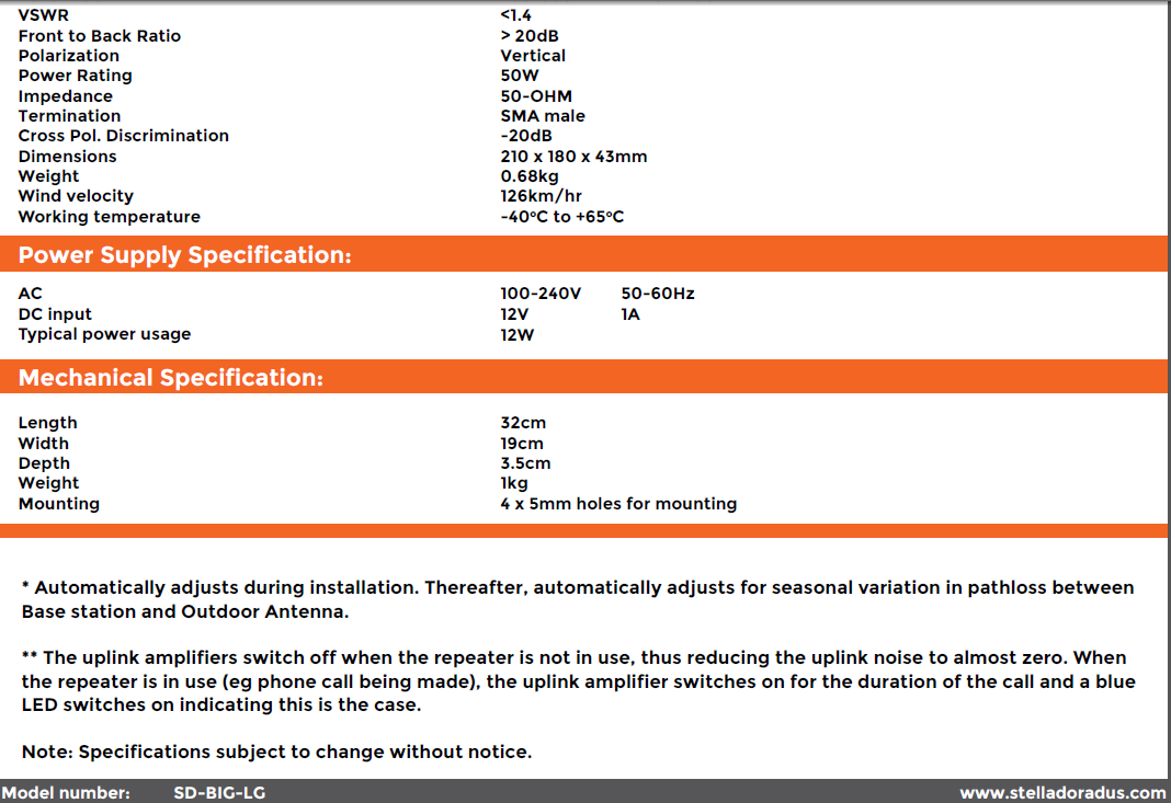Σημειώσεις για την εγκατάσταση: Η κεραία που δείχνει προς την κυψέλη του χειριστή θα πρέπει να είναι προσανατολισμένη περίπου 180 μοίρες από την κεραία στραμμένη σε περιοχές όπου απαιτείται κάλυψη. Αυτό γίνεται για να μειωθεί η ανάδραση μεταξύ των δύο κεραιών. Το BigBoost και το Stellahome Repeater, όπως φαίνεται στο παραπάνω διάγραμμα, ΠΡΕΠΕΙ να τοποθετηθούν σε ξεχωριστά αδιάβροχα δοχεία. ΜΗΝ ΤΑ ΤΟΠΟΘΕΤΕΙΤΕ ΣΤΟ ΙΔΙΟ ΚΟΥΤΙ. Αυτό γίνεται για να αποφευχθεί η ανάδραση και η υπερθέρμανση. Σημειώσεις για την εγκατάσταση του Συστήματος Big area boost :