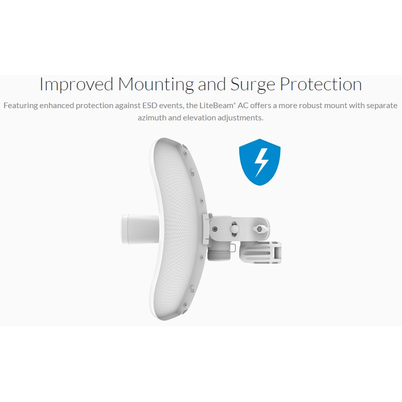 The LiteBeam 5AC Gen 2 directs RF energy in a tighter beamwidth. With the focus in one direction, the LiteBeam 5AC Gen 2 blocks or spatially filters out noise, so noise immunity is improved. This feature is especially important in an area crowded with other RF signals of the same or similar frequency.
